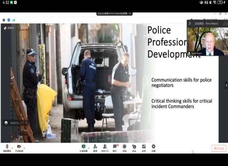 本次讲座围绕警察职业发展必备的沟通技巧与批判性思维,结合具体的案例与研究成果,分享了法律语言学研究成果的应用情况。讲座内容分两部分展开。第一部分讲述了Royce教授与澳大利亚警方的合作研究,重点介绍了警方谈判人员在处理各种危机和绑架事件时需要用到的沟通技巧。第二部分内容重点探讨了重大事件中警方高级指挥官的批判性思维。