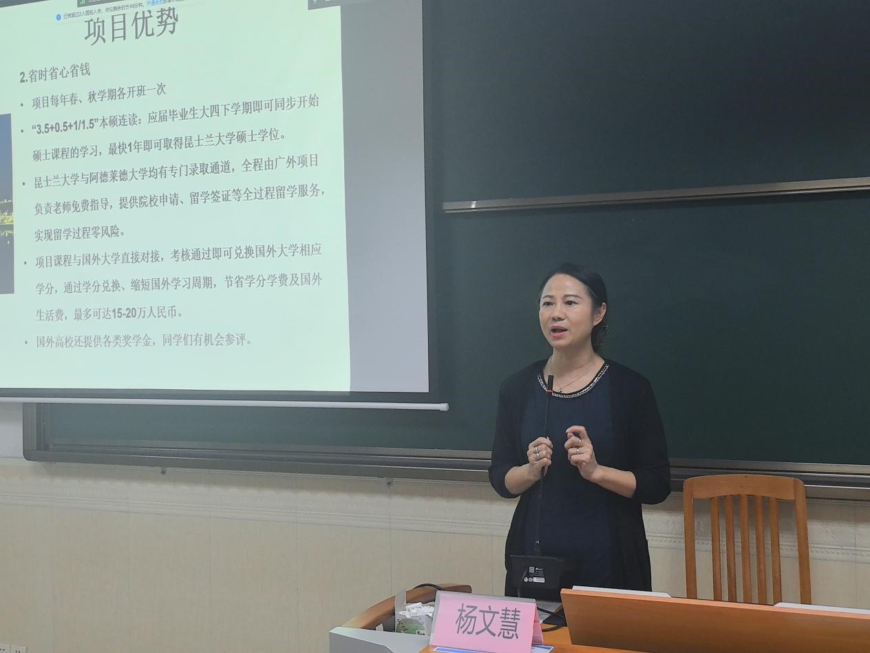 商英学院杨文慧副院长致辞,她介绍了商英学院国际交流合作概况,广外澳洲名校硕士项目情况、办学优势、毕业生去向等。她鼓励在场同学把握机会、积极申请名校商科硕士,表示学院将为同学们提供全方位的指导和帮助,学院将与国(境)外高校进一步加强合作,致力于培养更多高素质国际商务人才。